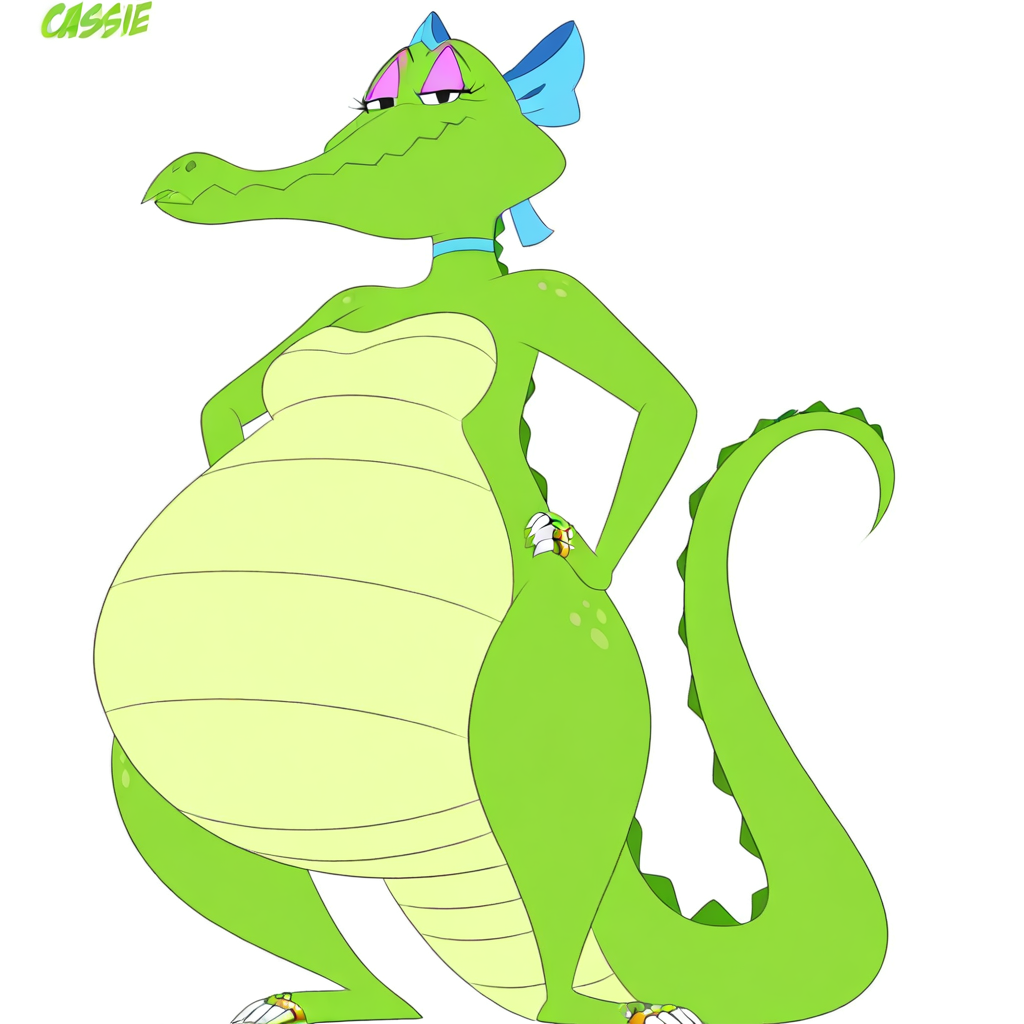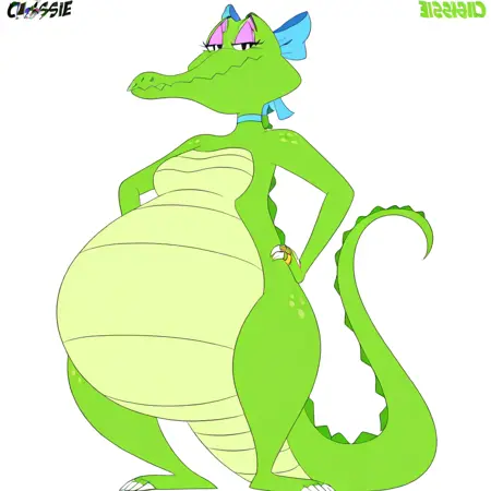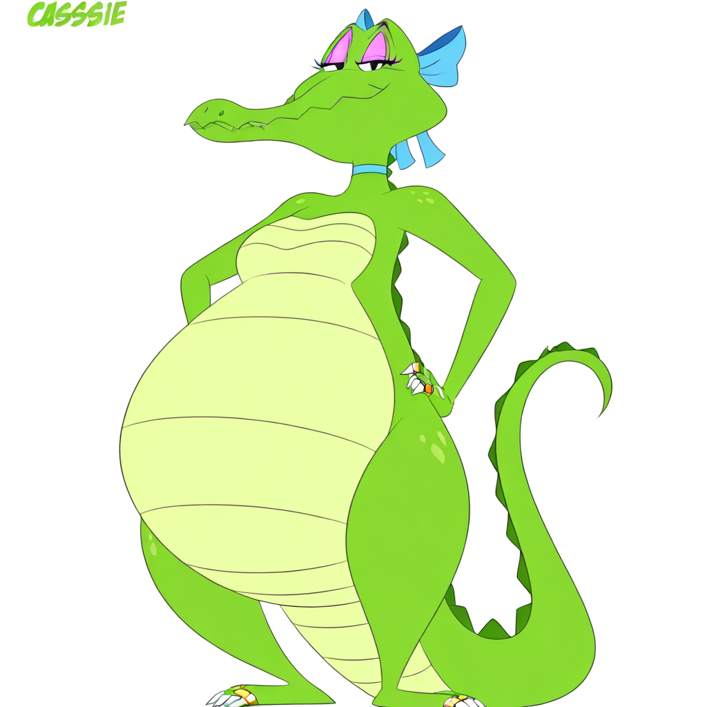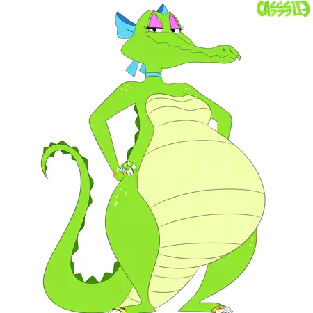 CassieTC, black eyes rings, female, blue fabric ring neck, blue bow ties, lady, four fingers, crocodile, pink eyes makeup, diva, solo, 1girl, smile, cartoon, green skin
