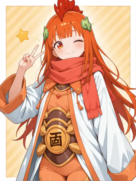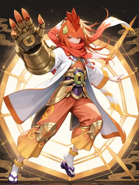 标签(服装):围巾遮口,和服,发饰,红围巾,橙色衬衫,白色外套,腰带,分趾袜,紫色凉鞋,橙色长裤