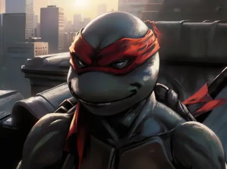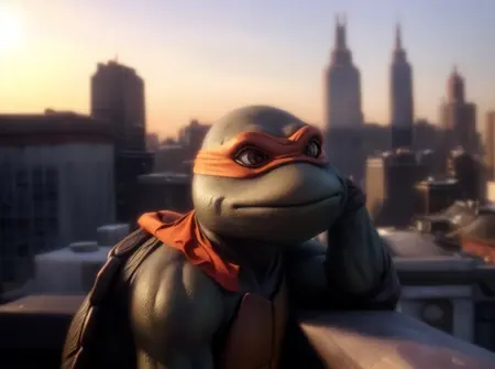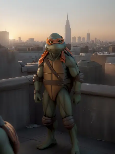 タートルのマスクの色が正しく生成されない場合、以下のフレーズを強く推奨します:「wearing purple/orange/blue/red bandana mask with eye-holes」(括弧とスラッシュは除く)。