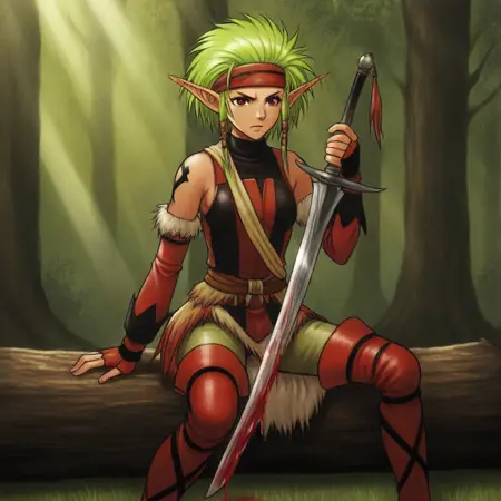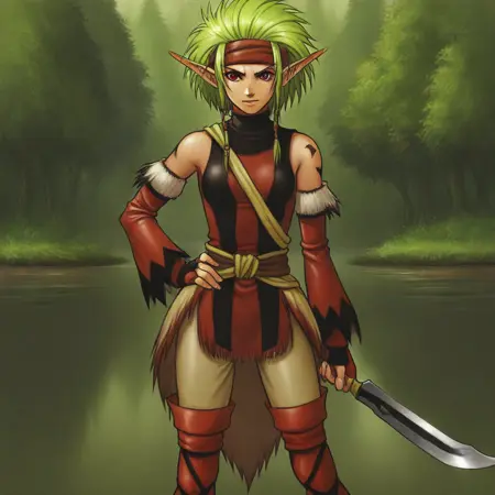 Selma (Suikoden), 1girl, エルフ, 尖った耳, 緑色の髪, 赤い目