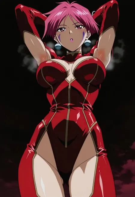 パニ、ピンクの唇、短い髪、ピンクの髪、顔の模様、ピンクの爪、赤いボディスーツ、ブーツ、ブレスレット、衣装の切り抜き、短めのジャケット、イヤリング、