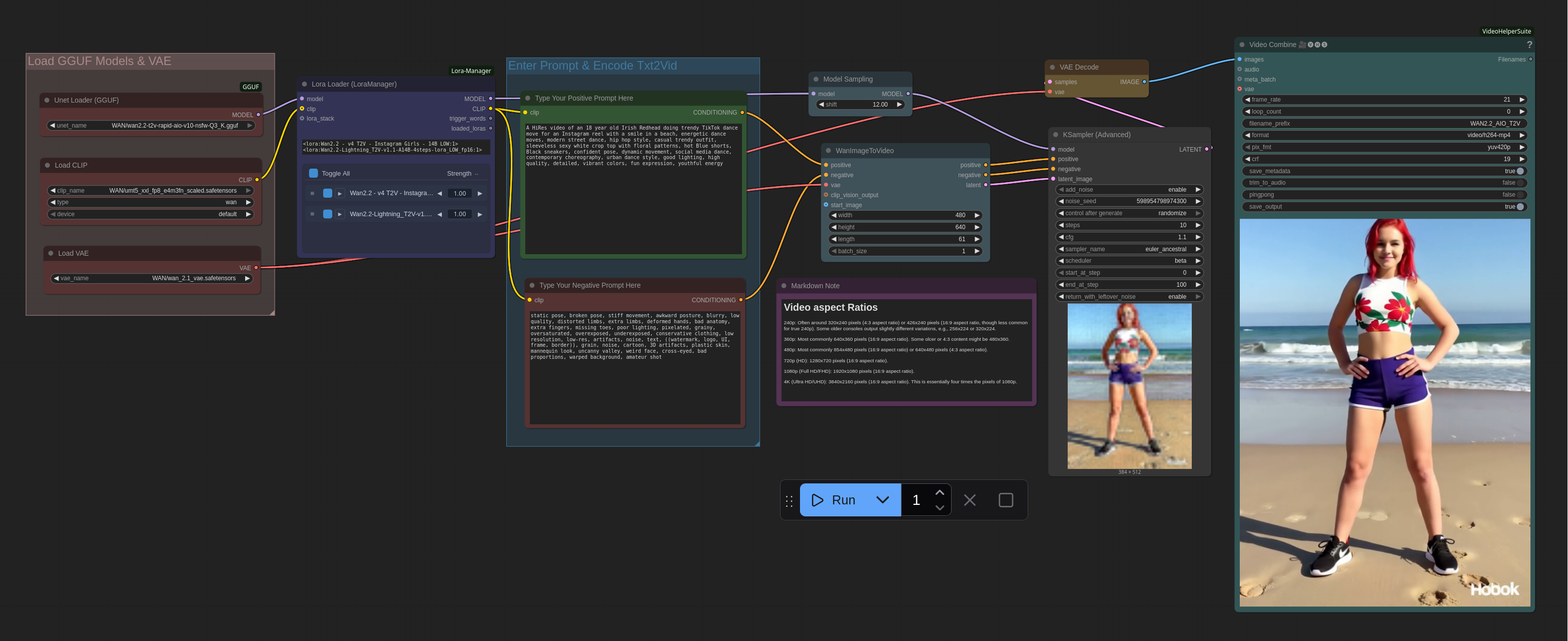 这是一个非常简单、适合ComfyUI初学者的文生图工作流,可与单个WAN 2.2 Rapid All-in-One GGUF模型配合多个LoRA使用(此工作流需要ComfyUI的LoRA Manager插件才能运行。建议同时安装ComfyUI Manager和LoRA Manager插件,以便轻松下载和管理检查点、LoRA及其他资源。这两个插件不仅对本工作流至关重要,还能在其他各种情况下为您提供极大帮助)。这是我对旧版WAN 2.1文生视频工作流的进一步优化。本工作流使用高度优化的WAN 2.2 Rapid All-in-One模型的量化(GGUF)版本,以保持流程简洁快速,使相对性价比高的GPU(如8GB/12GB的Nvidia或Radeon显卡,或部分更实惠的Apple Silicon Mac)能够高效运行WAN 2.2,无需同时加载两个单独模型处理低噪与高噪任务——AIO模型可一次性处理两者。您需要一个Hugging Face账户以下载所需的WAN 2.2 Rapid All-in-One文件(详情见下文)。请确保通过ComfyUI Manager安装GGUF插件,并将正确文件放置于对应位置。此外,也欢迎查看我为SD 1.5 + SDXL 1.0、WAN 2.1、Chroma、QWEN、HiDream和Flux制作的其他工作流。