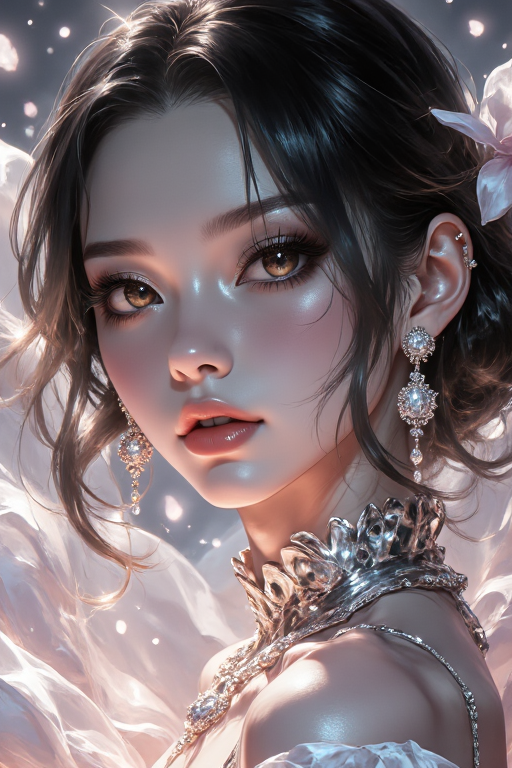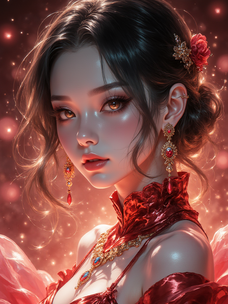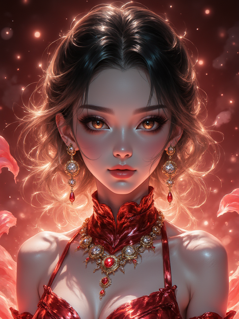 fusionstyle, masterpiece, best quality, portrait of <luna_fusion>, anime-realism, cinematic lighting, glossy skin, expressive eyes, elegant jewelry, soft background, aesthetic composition, detailed face