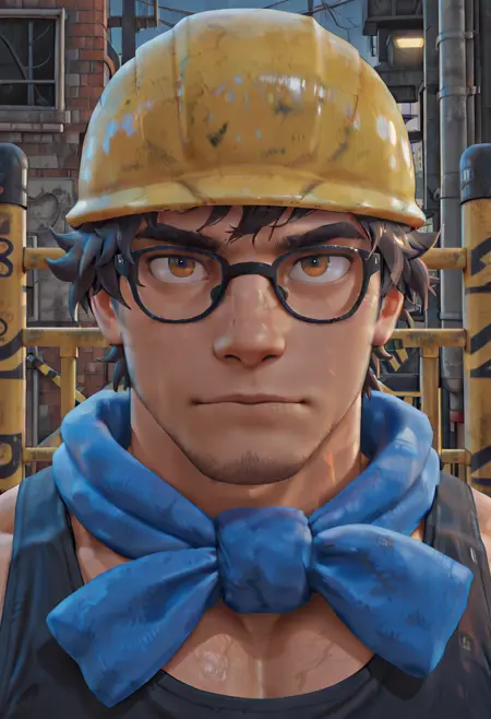 yellow hard hat, black tool belt, black tank top, blue scarf, black boots, green pants,