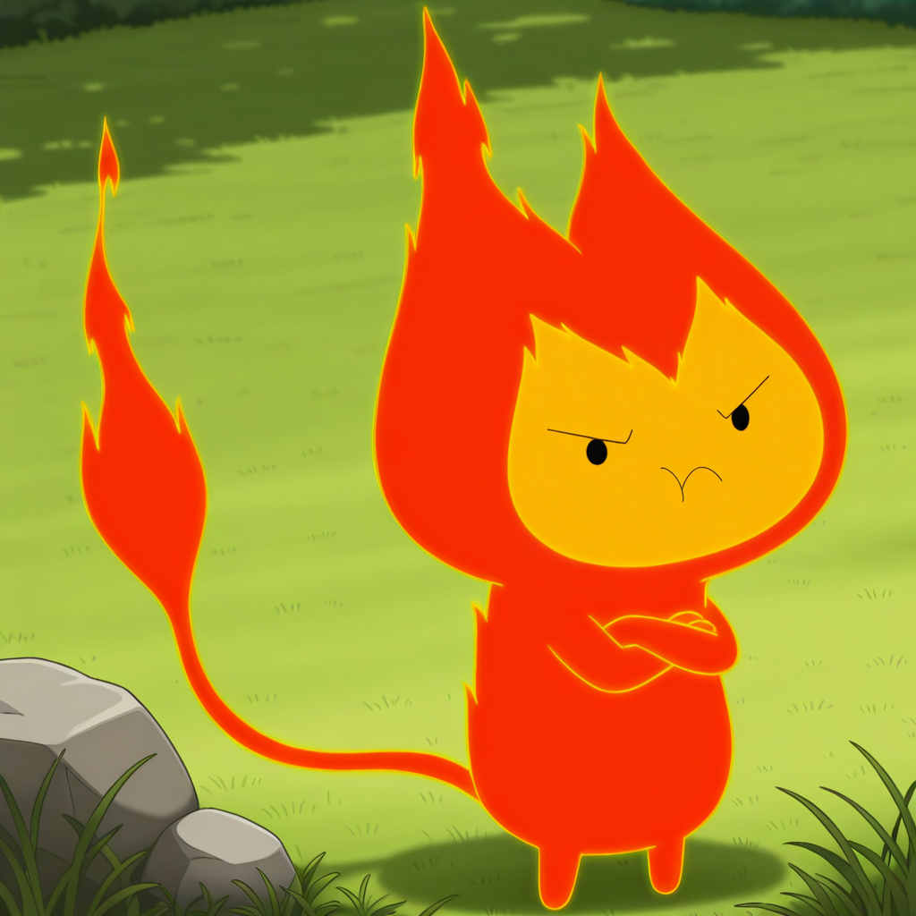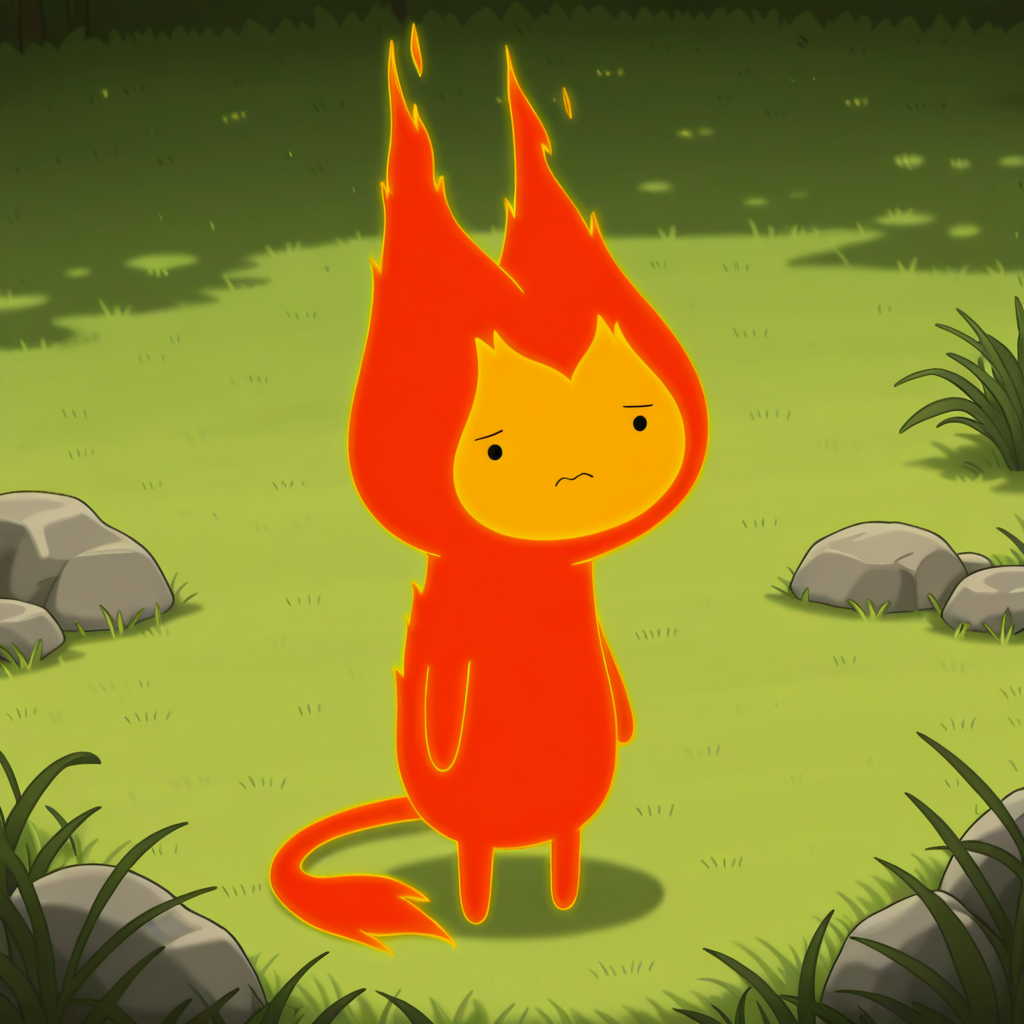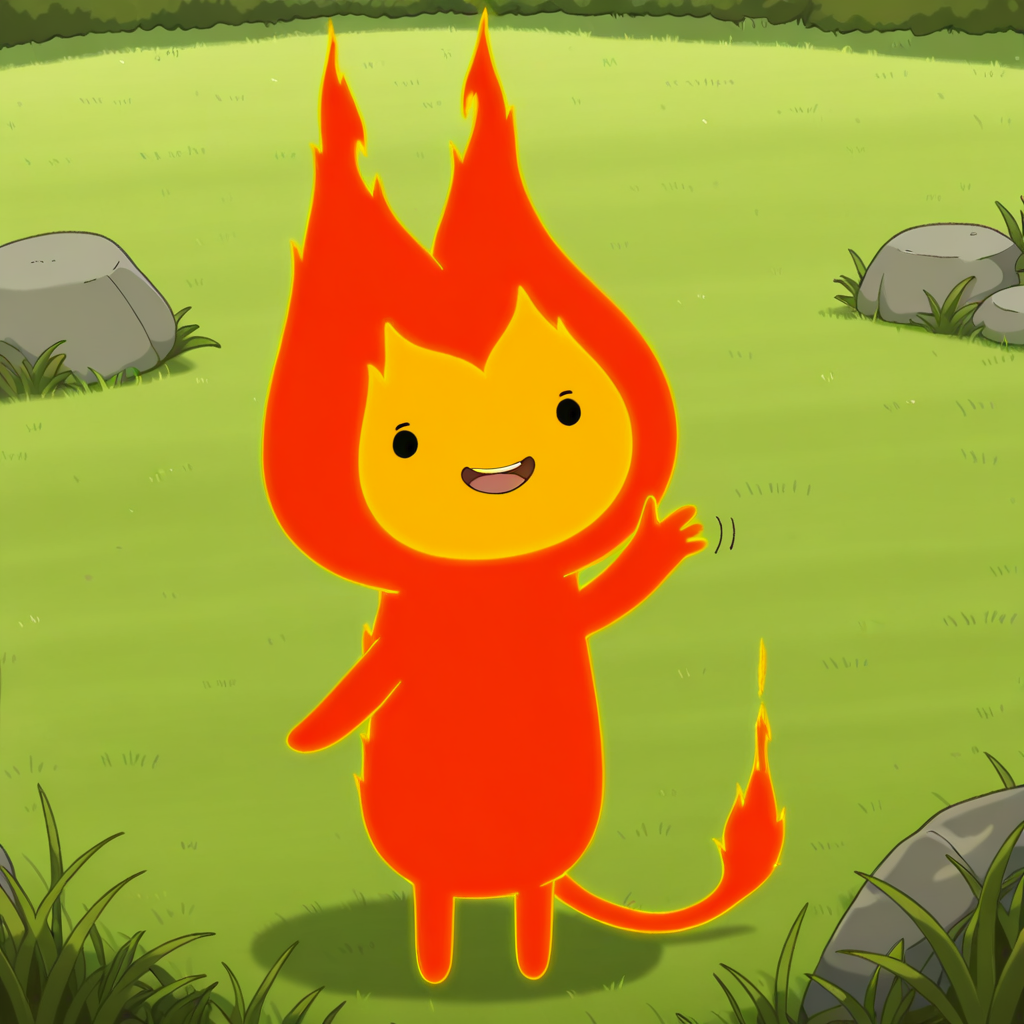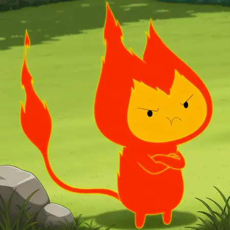1boy, male, elemental creature, fire creature, solo, orange body, yellow face, two-tone body, flame head, black dot eyes, tail, glowing outline