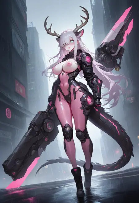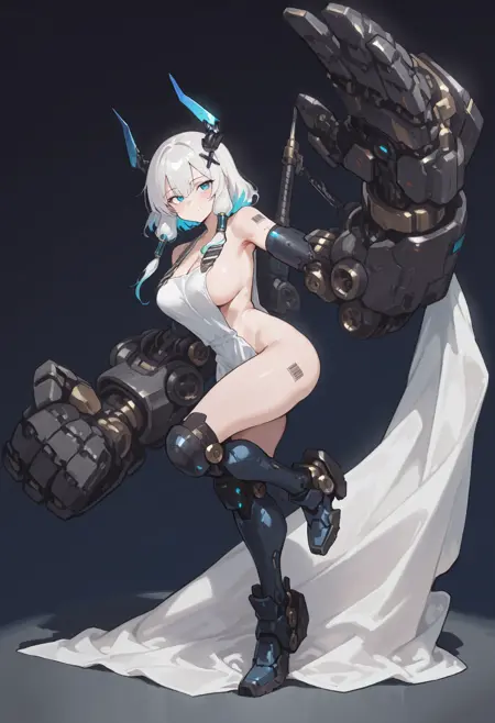 exosuit, mechanical arms, mechanical legs, mechanical hands, single mechanical arm, robot joints, prosthesis, prosthetic arm, head fins, antennae, cable, cable tail, oversized limbs, oversized arms