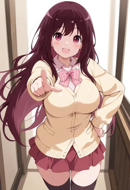 yellow cardigan,achiga school uniform,pink bowtie,plaid bow,red skirt,black thighhighs,