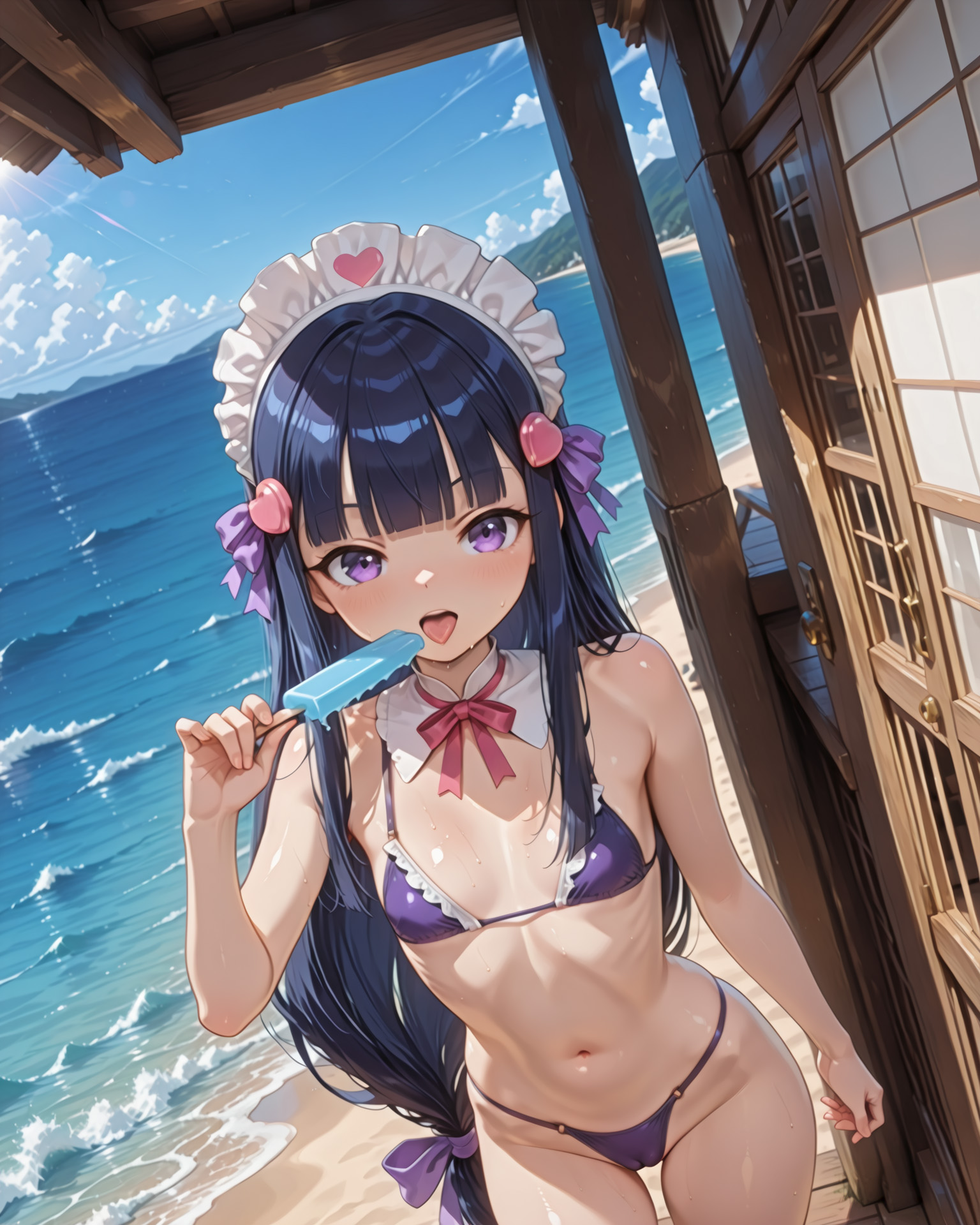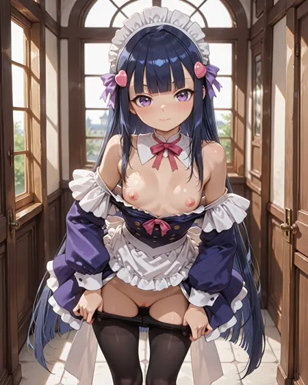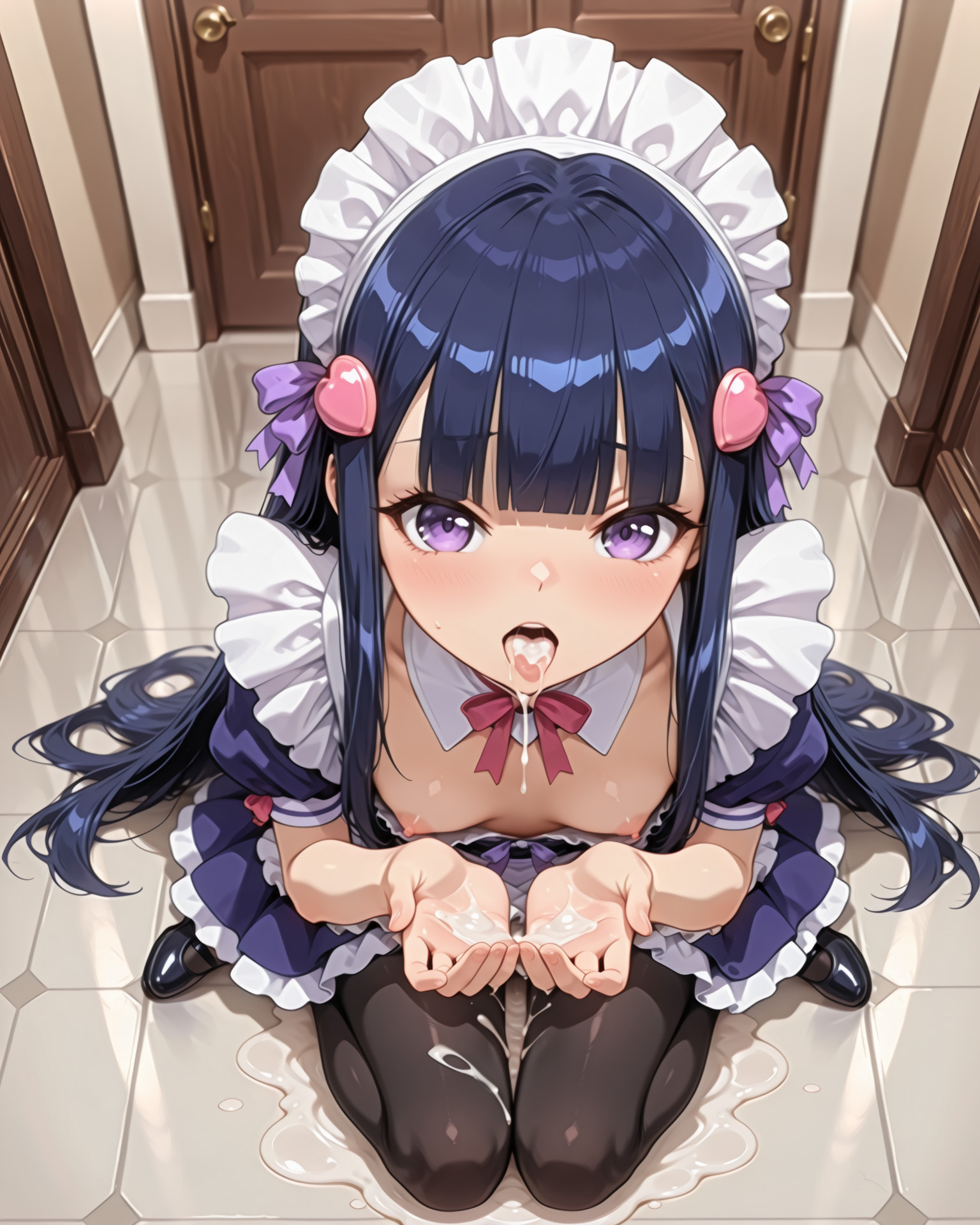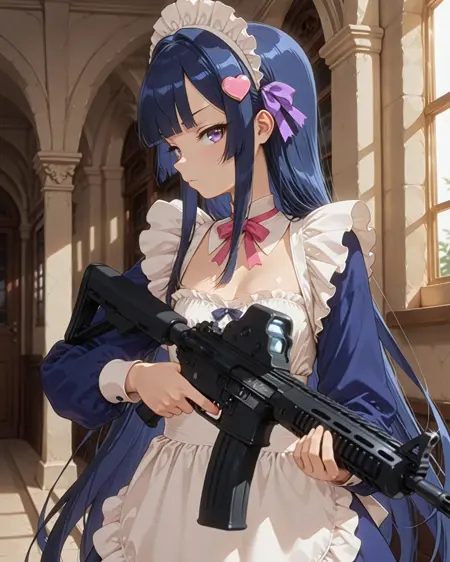 | 训练词汇 | 1girl,shiraha_nakadachiuri, purple eyes, very long hair, solo, maid headdress, purple maid uniform, maid, breasts, dark blue hair, anime coloring, pink heart-shaped hair ornament, long bangs, cleavage, blunt bangs, detached collar, ribbon, winged eyes, flat chest, black pantyhose, black mary jane shoes,已复制! |