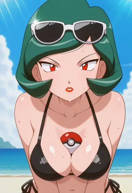 PMWendy, 1girl, 녹색 머리, 단발, 립스틱, 가슴,