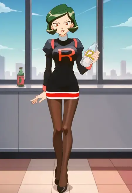 チームロケットのユニフォーム, 黒いショートドレス, 長袖, 茶色のパンティーストッキング,