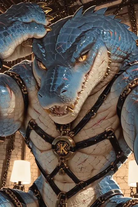 male, buff body, broad shoulders, thick arms, defined abs, powerful legs, muscular tail base, reptilian texture, heavy build, sharp claws, scales, scars