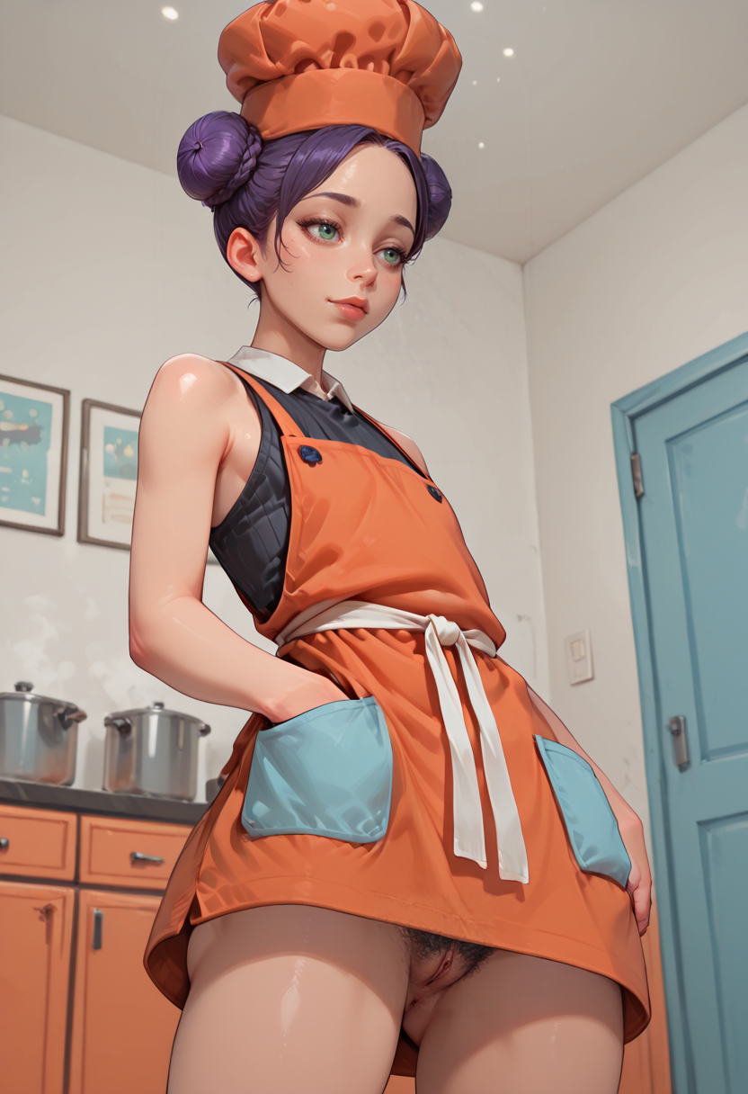 黒いノースリーブセーター、ウィングカラーオレンジのエプロン、白いウエストサッシュ、オレンジのシェフ帽