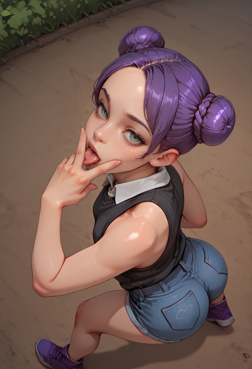 緑の目、紫の髪、短髪、二つ結び、編み込みベースの結び髪