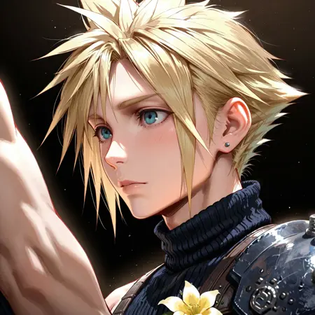 cloud strife, blonde hair, blue eyes, earrings, brown belt, 1boy, shoulder armor