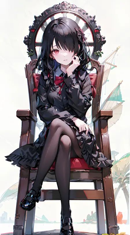 1girl, black footwear, black hair, black legwear, bow, chair, crossed legs, dress, full body, hair over one eye, hand on own face, long hair, long sleeves, looking at viewer, mary janes, pantyhose, red eyes, shoes, sitting, solo, transparent background, (beach:1.2)