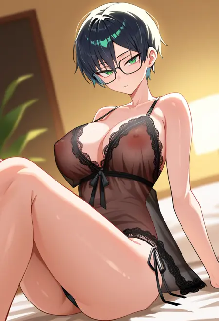 - kaedeww, tomboy, green eyes, tsurime, glasses, black-framed eyewear, black hair, short hair, hair between eyes,