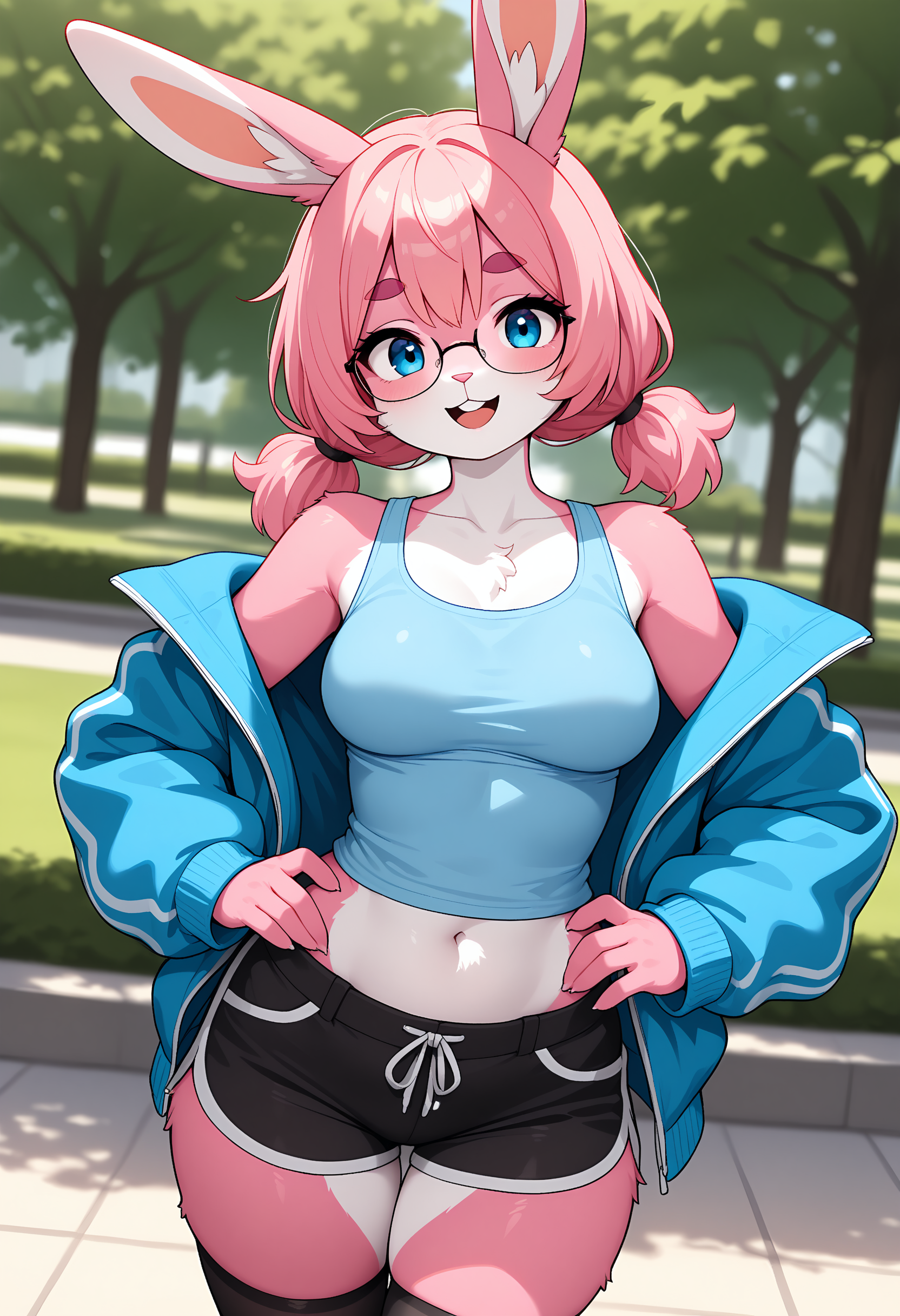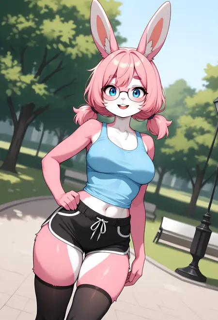 Nerine_Honeyhops, anthro, furry, adult female, bunny girl, white fur, pink fur, pink bunny ears, multicolored fur, short hair, pink hair, long twintails, low twintails, blue eyes, dark pink eyebrows, glasses, front teeth, curvy body, medium breasts,