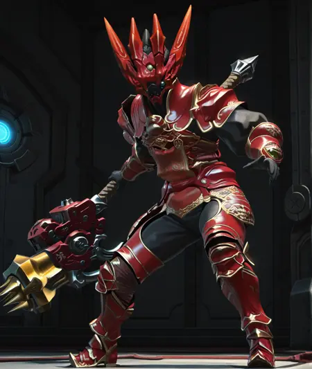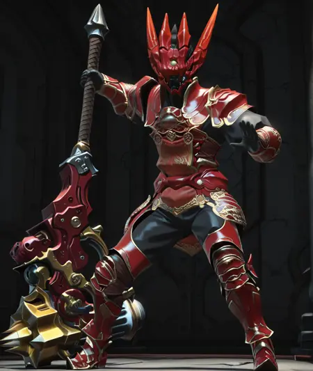 태그: NeroBase, 빨간 뿔 헬멧, 닫힌 헬멧, 화려한 헬멧, 검은 마스크, 얼굴 마스크, 마스크를 쓴 얼굴, 금속 판금, 금장식, 빨간 갑옷, 전신 갑옷, 화려한 갑옷, 무거운 갑옷, 가슴판, 장식적인 빨간 큐라스, 검은 천, 어깨 갑옷, 검은 소매, 갑옷 장갑, 검은 하의, 갑옷 하의, 갑옷 부츠, 1소년, 남성 중심,