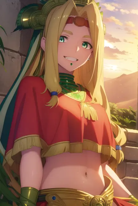 quetzalcoatl、長い髪、金髪、(緑の目:1.5)、低く結んだ長い髪、