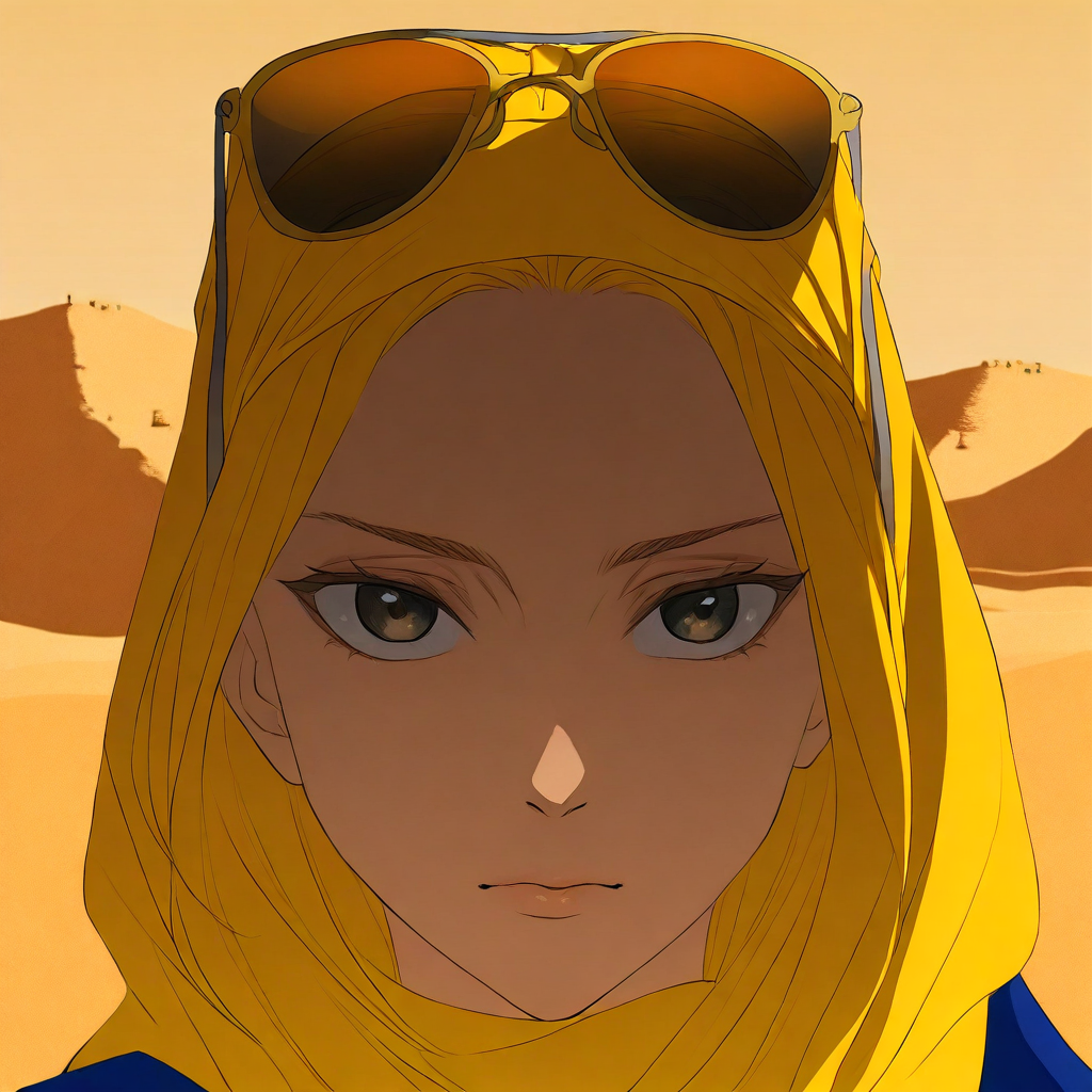 , yellow hijab, blue uniform, sunglasses on head, dark hair, dark eyes,