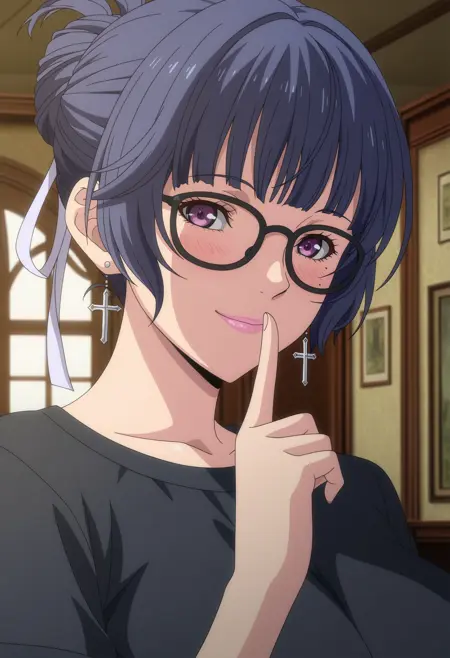 1girl, Katagiri Aira, blue hair, short hair, purple eyes, single hair bun, hair ribbon, pink lips, mole under eye, glasses, cross earrings