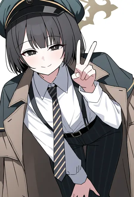 hat,green hat,peaked cap,long sleeves,white shirt,collared shirt,suspenders,shirt tucked in,striped necktie,diagonal-striped necktie,black necktie,brown coat,coat on shoulders,black belt,vertical-striped pants,black pants,striped pants,