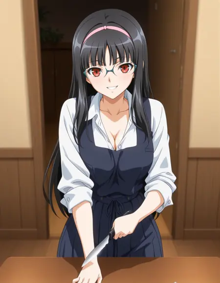 mai_ks3,mai_ren3,long_hair,blunt_bangs,black_hair,purple eyes, blue-framed_eyewear,hairband,ribbon,school_uniform,black_pantyhose