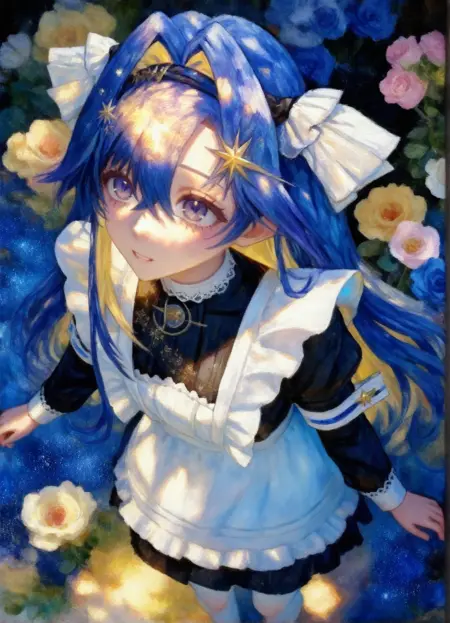 触发词:yuanlv,1girl,蓝色头发,黄色内发,黑色发带,白色发结,星星发饰,发丝垂于额头,紫色眼睛,长发,朱丽叶袖,
