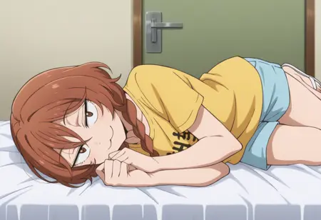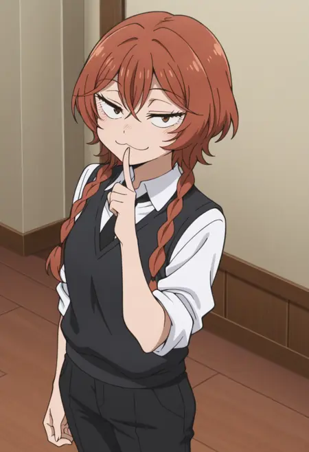 Kazao niko 외모: 1소녀, 긴 머리, 갈색 머리, 트윈테일, 갈색 눈, 땋은 머리, 빨간 머리, 트윈 땋은 머리, 어깨에 걸린 머리, :3, 산파쿠