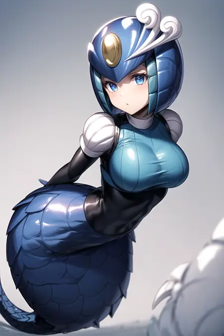 splash woman \(Mega man\), blue helmet, mermaid, solo, monster girl, 1girl, android, black suit, elbow gloves, blue eyes, white gloves