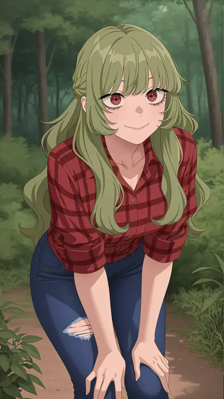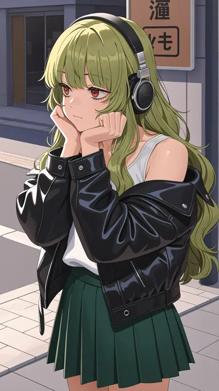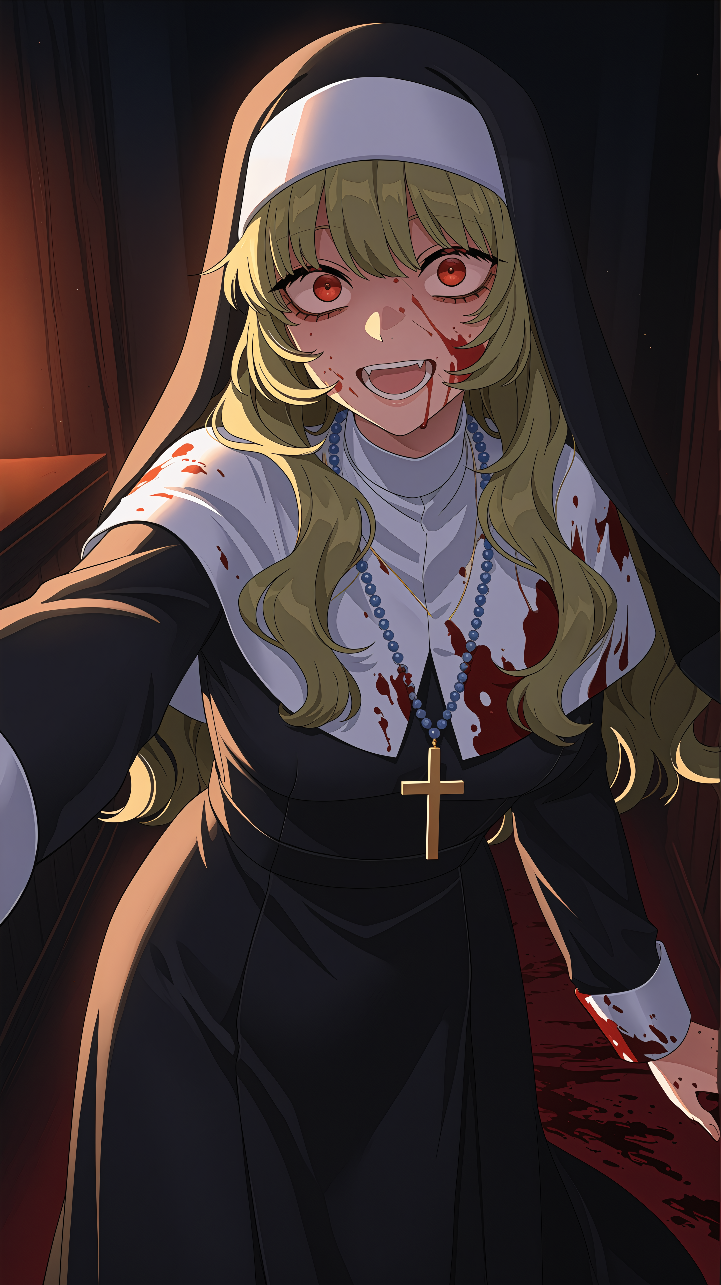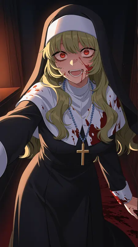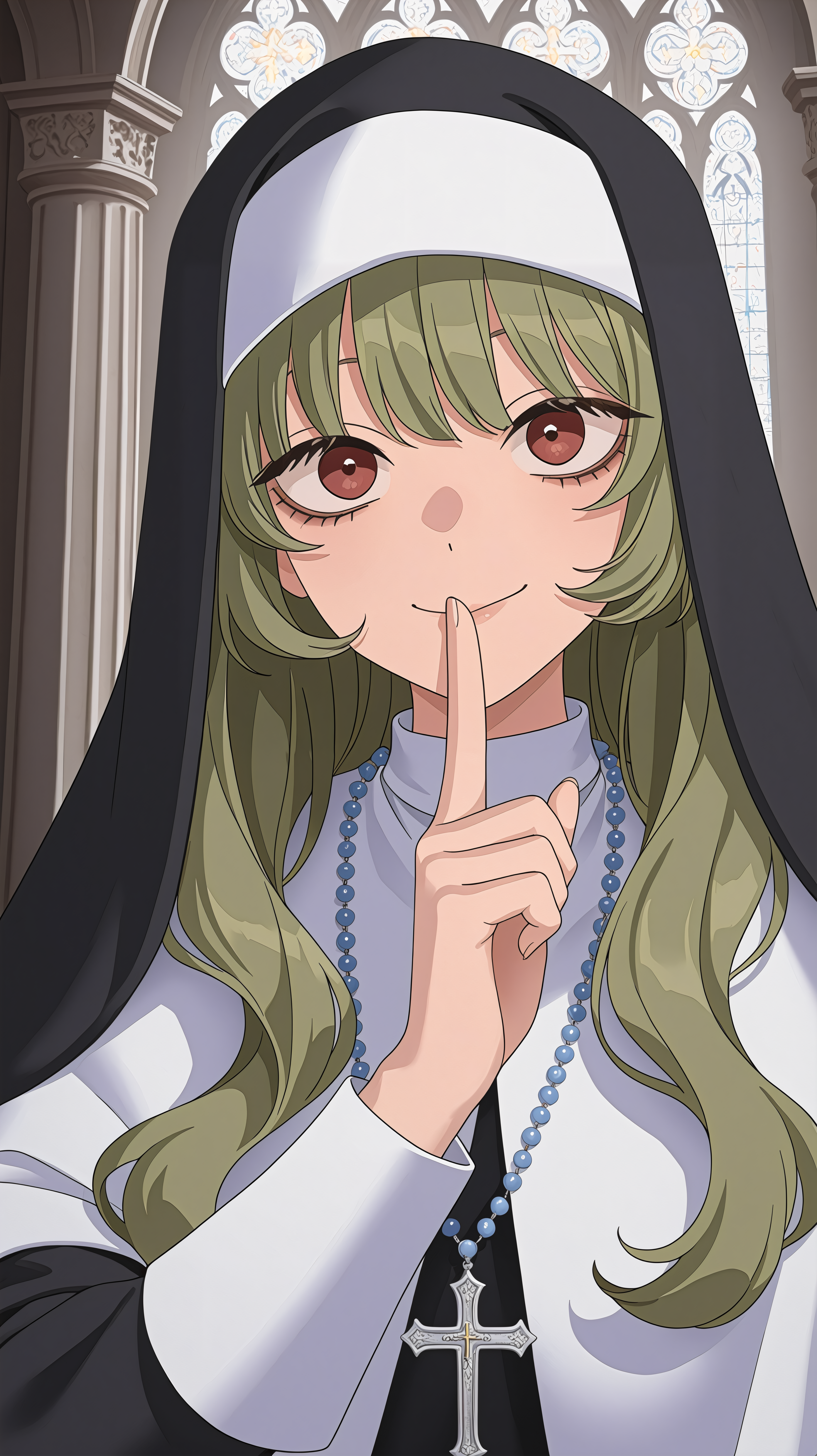 charlotte_mdud, green hair, long hair, sidelocks, bangs, dark red eyes, nun outfit, cross necklace, blue bead necklace,