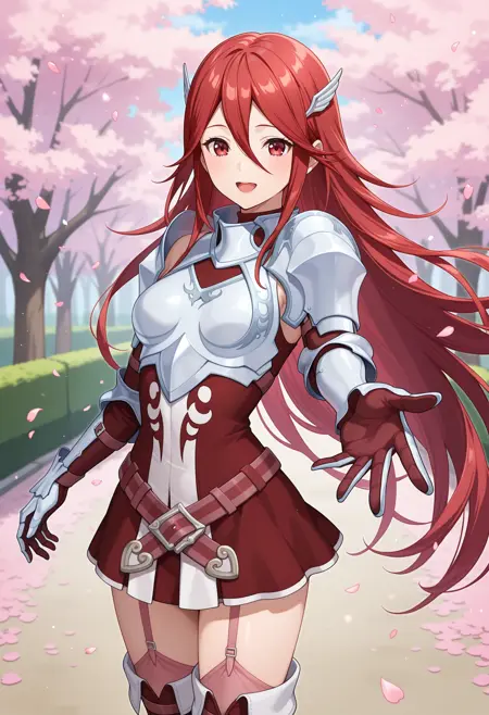 outfit1aatiamo, long hair, red hair, hair ornament, red eyes, shoulder armor, breastplate, armored dress, red dress, gauntlets, belt, garter straps, thigh boots