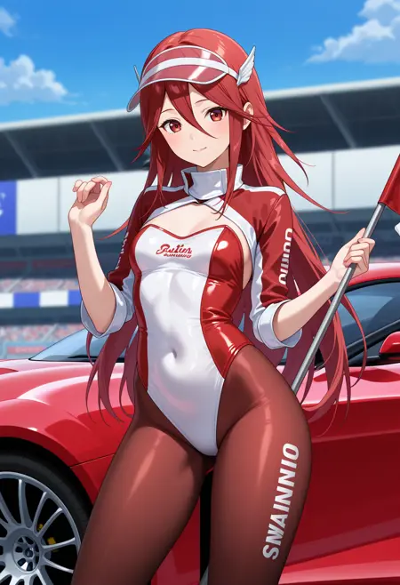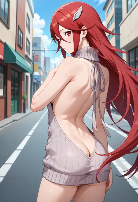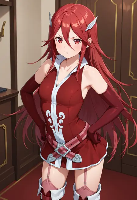 outfit1-1aatiamo, long hair, red hair, hair ornament, red eyes, collarbone, red dress, sleeveless, elbow gloves, red gloves, belt, garter straps, thigh boots