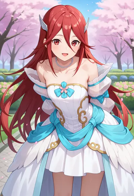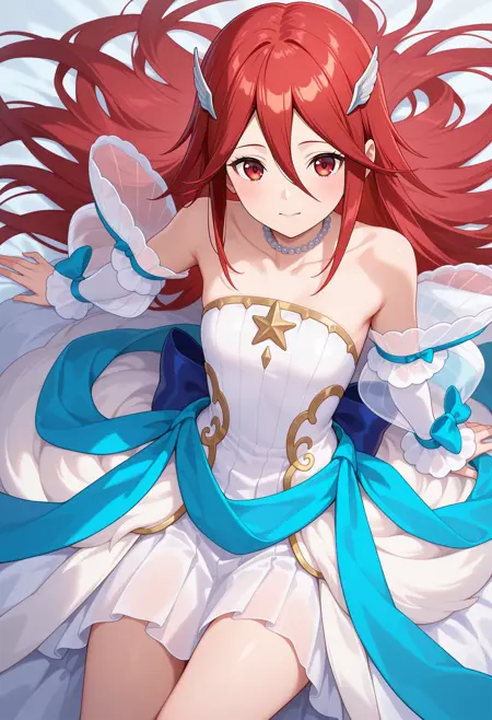 outfit3aatiamo, long hair, red hair, hair ornament, red eyes, bead necklace, collarbone, bare shoulders, strapless dress, white dress, detached sleeves, long sleeves, blue bow