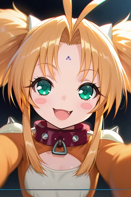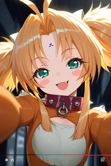nia, 1girl, solo, looking at viewer, blonde hair, gloves, animal ears, twintails, green eyes, tail, full body, collar, bodysuit, spikes, animal hands, forehead mark, retro artstyle, animal costume, paw gloves, jaggy lines, paw shoes, orange hair, flat chest, bell,
