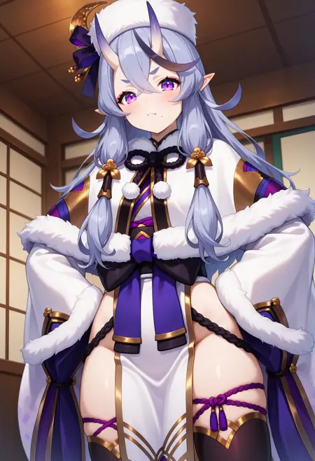 outfit2bbmikoto, long hair, streaked hair, horns, fur hat, white headwear, hair tubes, purple eyes, fang, mole under mouth, fur trim, white capelet, white kimono, wide sleeves, sleeves past fingers, pelvic curtain, thigh strap, black thighhighs