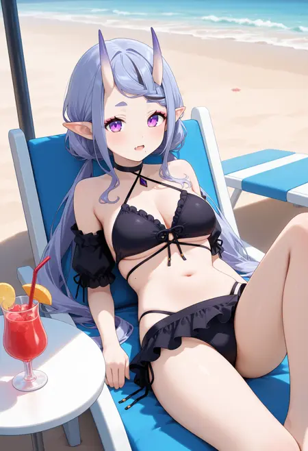outfit6ffmikoto, long hair, streaked hair, low twintails, horns, braided bangs, purple eyes, fang, mole under mouth, bare shoulders, black choker, halterneck, frilled bikini, black bikini, detached sleeves, bikini skirt