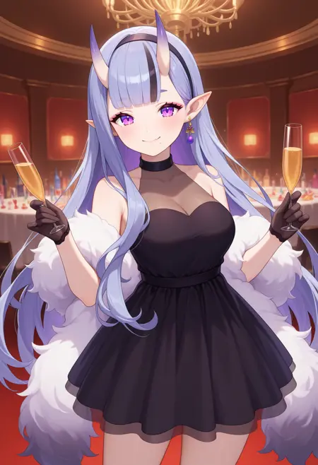 outfit4ddmikoto, long hair, streaked hair, horns, black hairband, blunt bangs, earrings, purple eyes, fang, mole under mouth, feather boa, see-through cleavage, black dress, sleeveless, black gloves