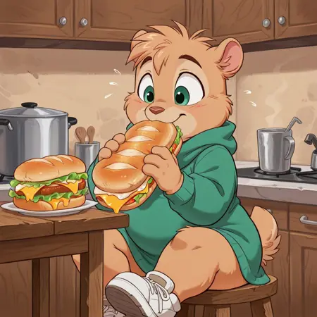 chipmunk male, shortstack solo, tan fur, messy head fur, round ears, light green eyes, chubby, enormous green sweatshirt with large collar, white shoes with light blue accents, four fingers,