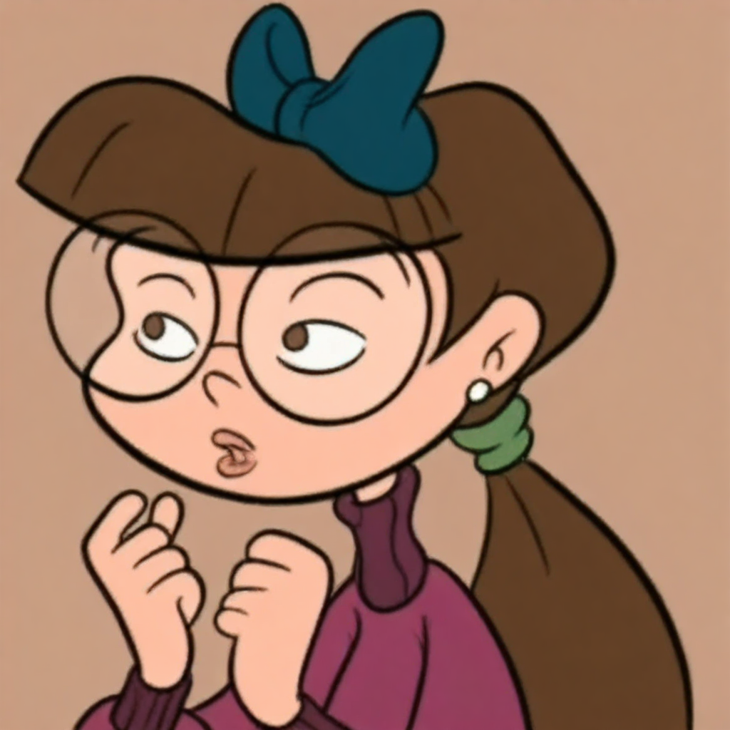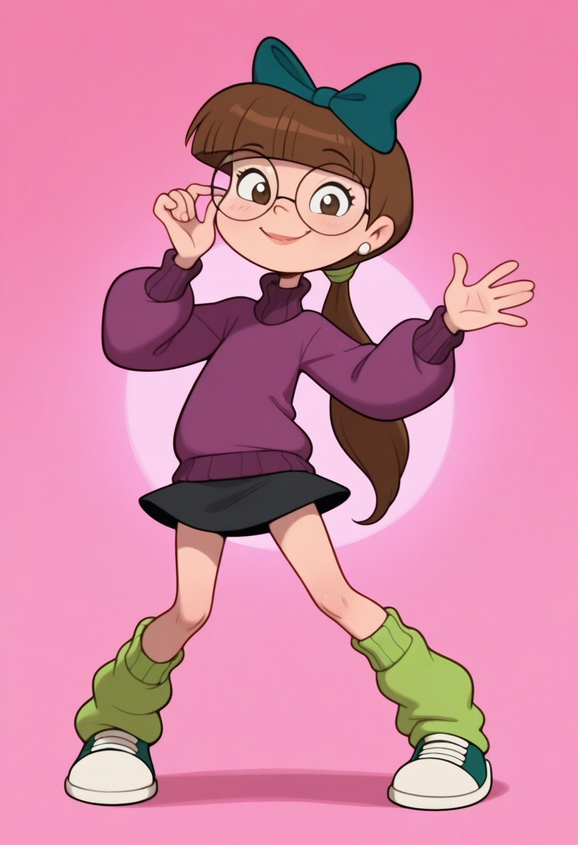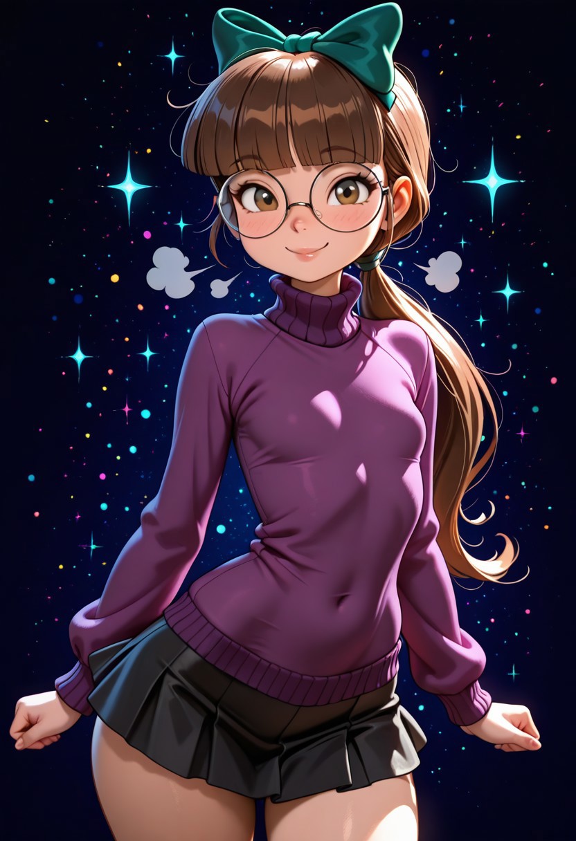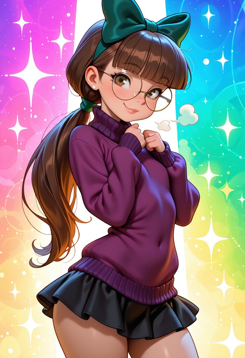 circular-frame eyewear, glasses, green bow, hair-bow, purple sweater, turtleneck, long sleeves, mini skirt, black skirt, green socks, loose socks, slouchy socks, green shoes with white toes,