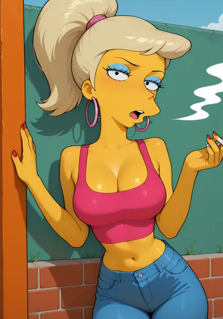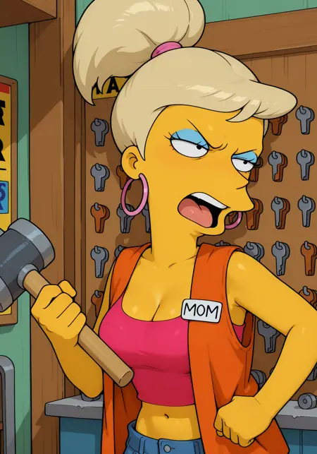 他の多くのLoRAと比較すると、彼女はそれなりのスクリーンタイムを持っているが、このLoRAの作成は難しかった。というのも、彼女は全体を通して退屈という一つの表情しかしていないからだ。また、シンプソンズ特有の顔の構造では、複数のLoRAを使わずに正常に動作させるためには、顔の表情の全範囲が必要となる。しかし、最初に失敗したLoRAを活用して追加の表情を生成し、2回目の試行で満足のいく結果を得ることができた。名札のテキストが実際に機能していることにとても驚いた。