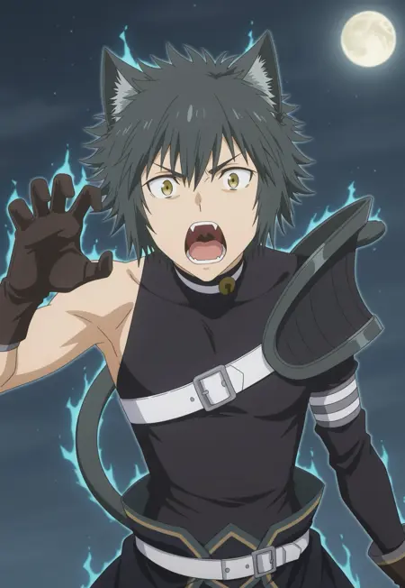 Outfit 2: collar with bell, single_sleeve, chest_strap, single pauldron, single armband, gloves, waist cape, baggy pants,