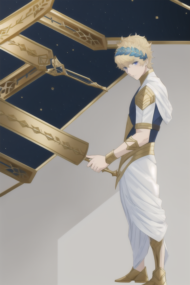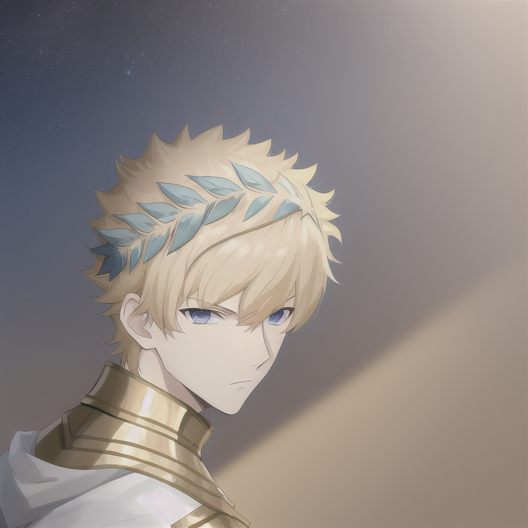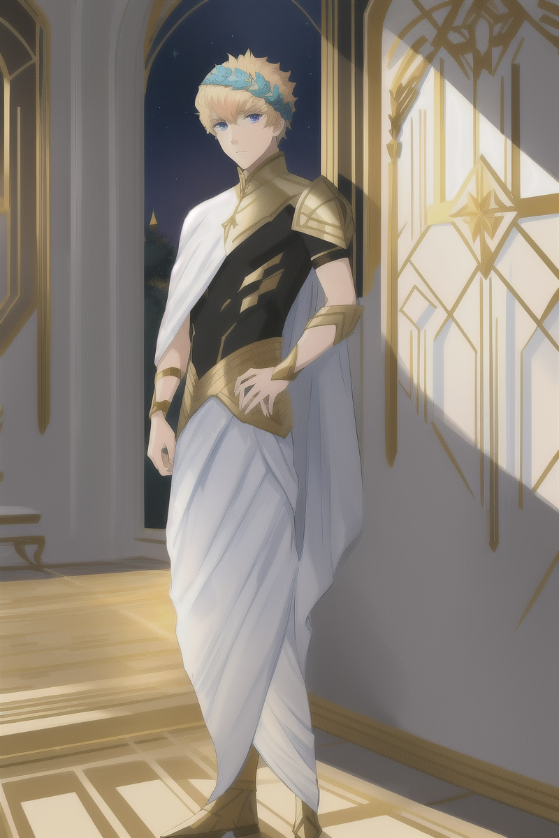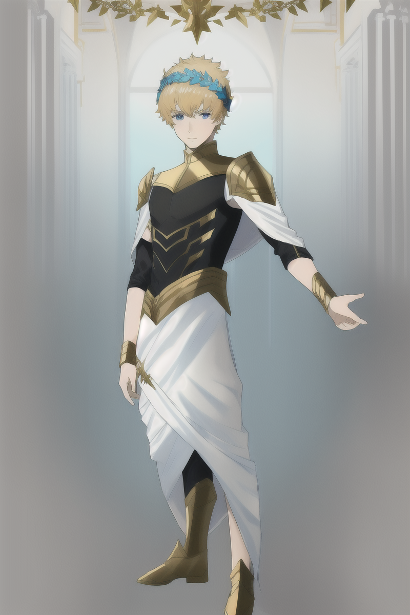 カストール(フェイト)、1人の少年、カストール_(フェイト)、薄い金髪、青い目、古代ギリシャ風の衣装、ティアラ、金属製の頭飾り(月桂樹の冠)、黒い下着、腕輪、鎧、フェイト(シリーズ)、フェイト/グランドオーダー