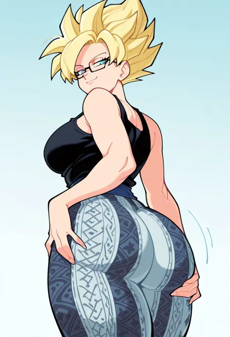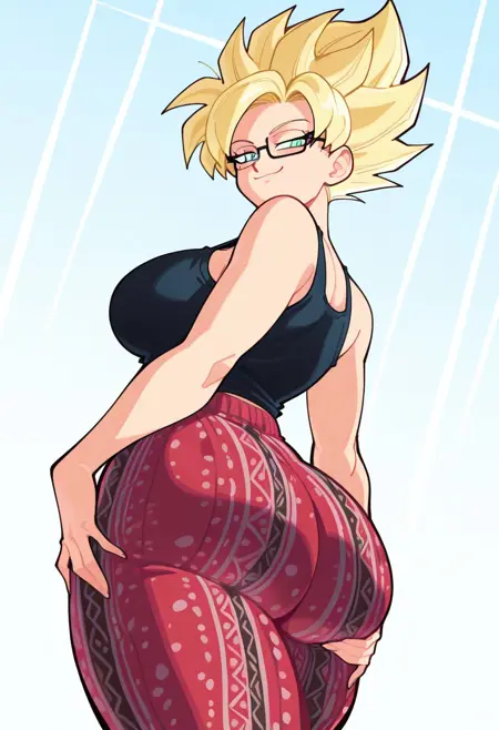 暗い肌の女性、筋肉質な女性、長いまつげ、分け目のある前髪、1girl、女性サイヤ人、とがった髪、スーパーサイヤ人、金髪、大きな胸、水色の目、虹彩なし、黒い長方形の眼鏡、