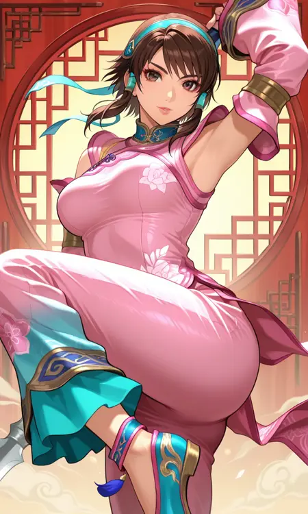 xianghua、1girl、一人、茶色の髪、短い髪、茶色の目、長い横髪、髪のチューブ、アクア色の髪リボン、マンダリンカラー、中国服、ピンクの取り外し可能な袖、ズボン、アクア色の足首輪、アクア色の靴、アクア色のヘアバンド