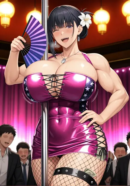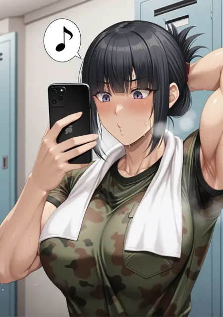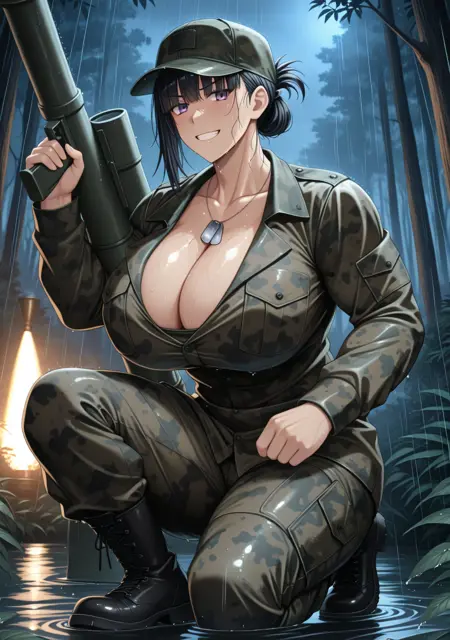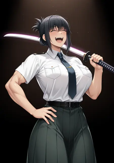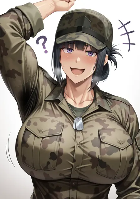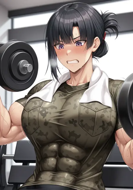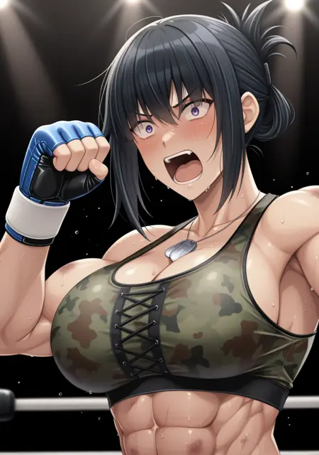 "huge breasts, short hair, side-bangs, folded ponytail, black hair, purple eyes, muscular female, abs"