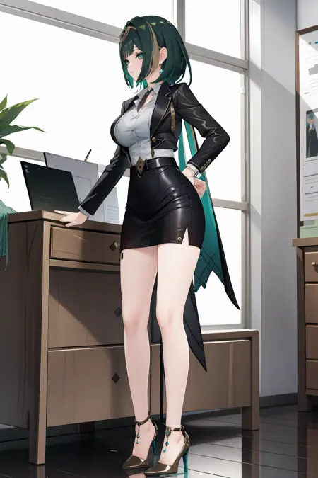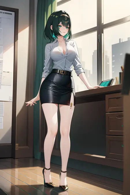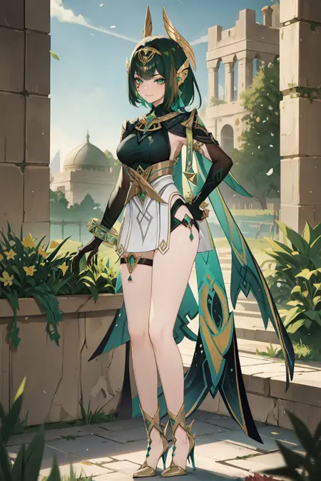 她的默认服装可添加或删除的额外提示词:眼部纹身、机械耳、王冠、角状头饰、黑色肘部手套、手镯、使用克项圈、斗篷、绿色无袖紧身衣、高腰半裙、大腿绑带、细带高跟鞋
