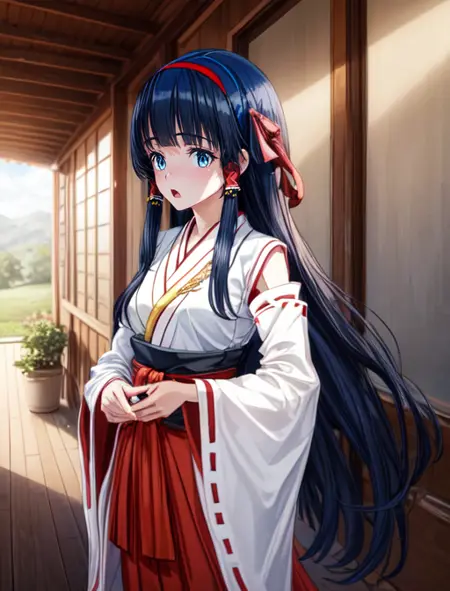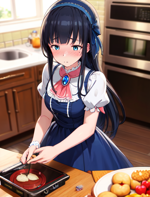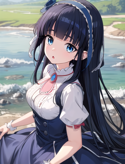 Additional words that may help: blue hairband, blue eyes, black hair, long hair