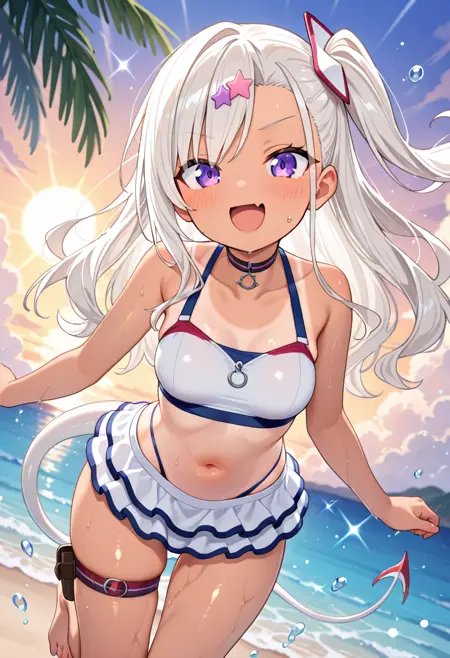 꼬리, 초커, 수영복, 흰 비키니, 탱키니, 별(기호), 배꼽, 비키니, 흰 치마, 비키니 치마, 어깨 노출, 쇄골, 허벅지 스트랩, 맨발,