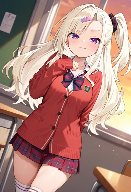 archerfish_gal,1girl,solo,white hair,long hair,asymmetrical bangs,one side up,star hair ornament,purple eyes,hair scrunchie,black scrunchie,red cardigan,long sleeves,white shirt,red skirt,pleated skirt,plaid skirt,miniskirt,collared shirt,kneehighs,white socks,loafers,